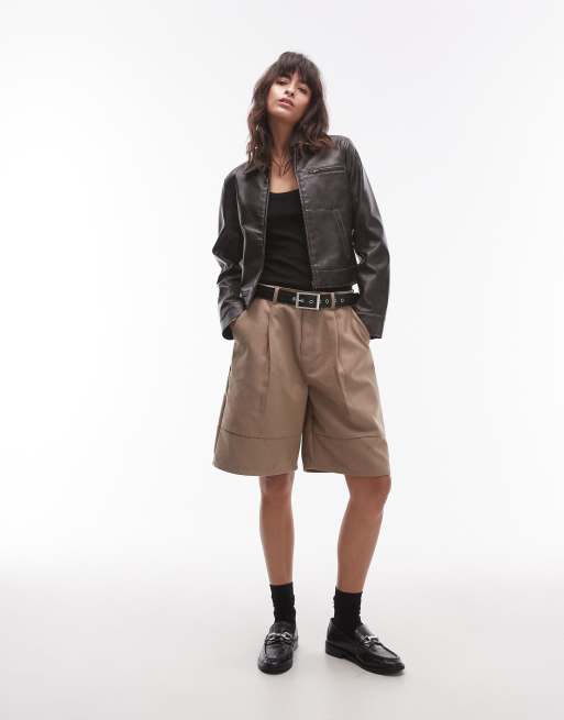 Topshop – Bermudashorts aus Wildlederimitat in Hellbeige