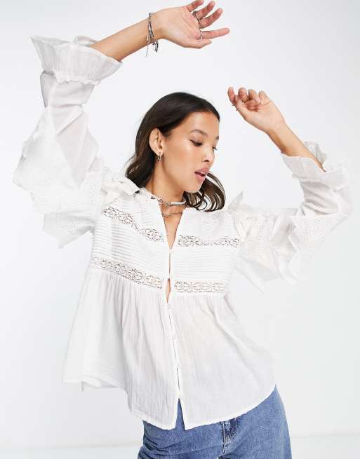 Topshop – Bluse aus Baumwoll-Spitze-Mix mit Knopfleiste in Elfenbeinweiß