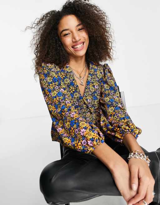 Topshop – Bluse in Blau mit langem Kragen und Blumenmuster - MBLUE