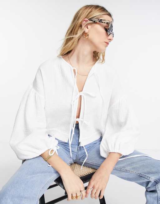 Topshop – Bluse in Weiß mit Knitteroptik und Schnürung vorne