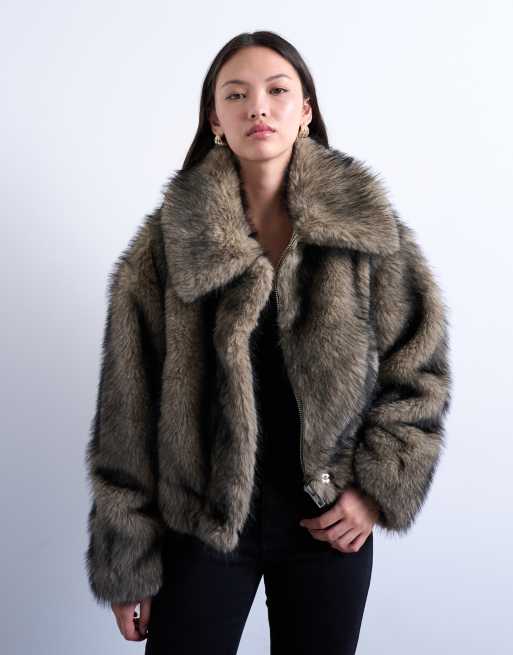 Topshop – Bomberjacke aus Kunstpelz in Natur mit Reißverschluss