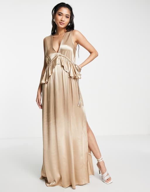 Topshop – Brautjungfernkleid in Gold mit gerüschtem Schößchen - NAVY