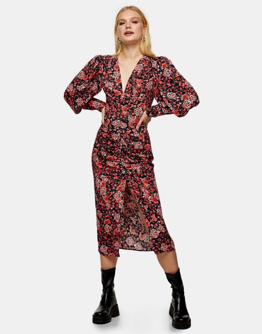 Topshop – Buntes Midikleid mit geraffter Vorderseite und Blumenmuster