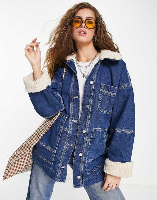 Topshop – Carpenter-Jeansjacke in Indigo mit Teddyfell