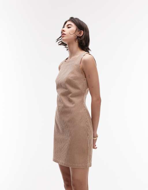 Topshop – Elegantes Jeanskleid in gestreiftem Hellbraun mit eckigem Ausschnitt