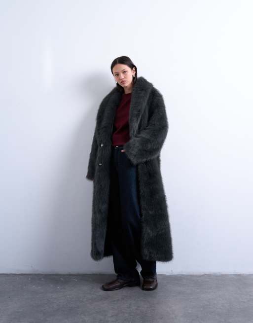 Topshop – Extralanger Oversize-Mantel aus Kunstpelz in Anthrazit mit Schalkragen