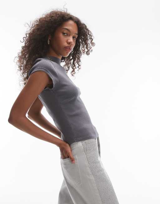 Topshop – Figurbetontes, geripptes T-Shirt in Schiefergrau mit Acid-Waschung und abgerundetem Saum