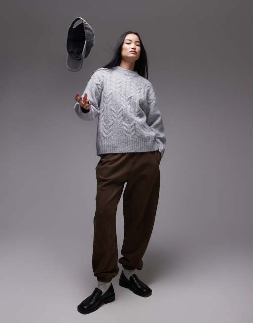 Topshop – Flauschiger Oversize-Strickpullover in Grau mit Zopfmuster