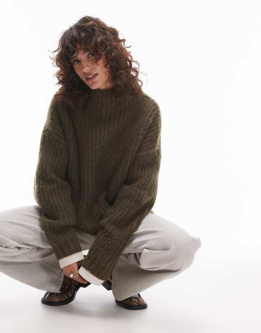 Topshop – Flauschiger Oversize-Strickpullover in Khaki