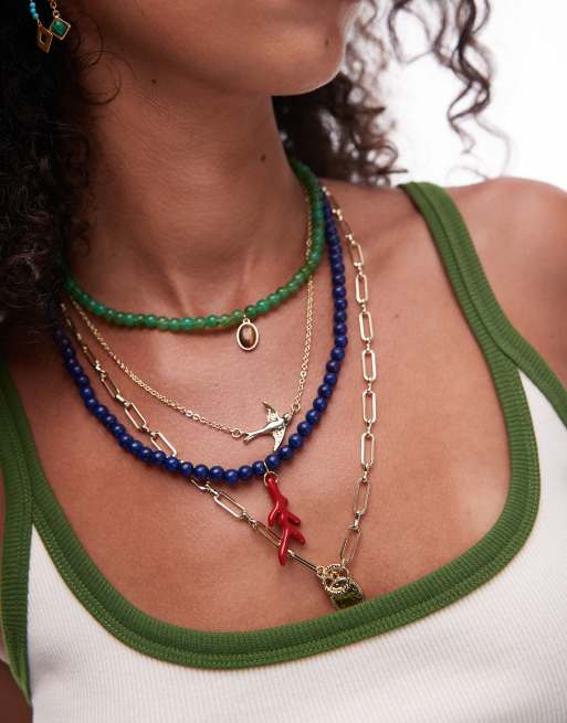 Topshop – Frida – Mehrreihige Perlenkette in Kobaltblau und Grün mit Anhängern