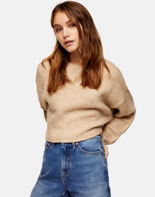 Topshop – Gebürsteter, kurzer Pullover in Camel