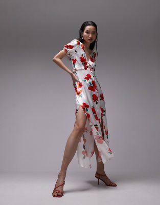 Topshop – Gemustertes Maxikleid mit V-Ausschnitt, Mohnblumenprint und Flatterärmeln