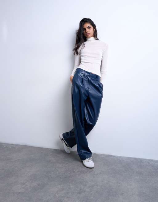 Topshop – Gerade geschnittene Hose aus Kunstleder in Marineblau mit hohem Bund und Bundfalten