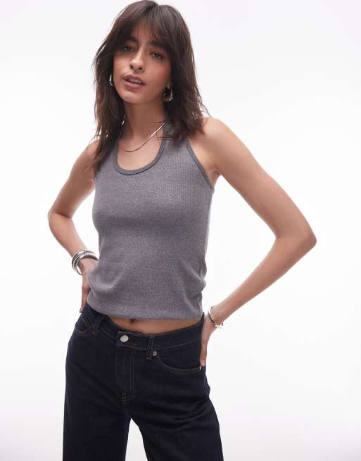 Topshop – Geripptes Neckholder-Oberteil in meliertem Grau