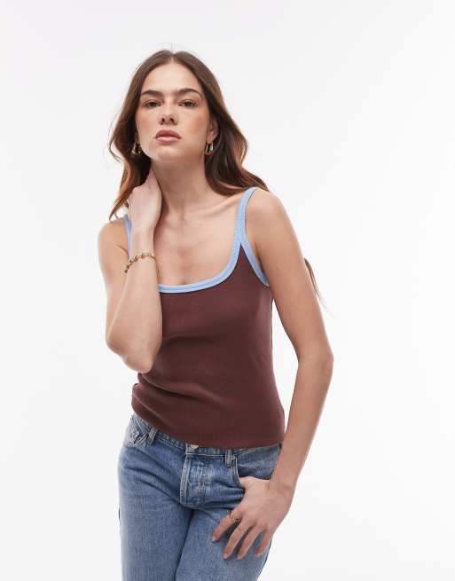 Topshop – Geripptes Trägertop in Schokobraun mit tiefem Ausschnitt, schmalen Trägern und Rand in kontrastierendem Blau
