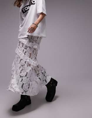 Topshop – Gerüschter Midirock aus Spitze in Weiß mit Muschelmuster