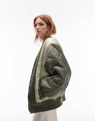 Topshop – Gesteppte Bomberjacke im Patchwork-Design in Khaki