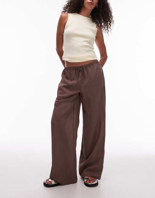 Topshop – Gestreifte Hose in Schokobraun mit weitem Bein und Kordelzug, Kombiteil