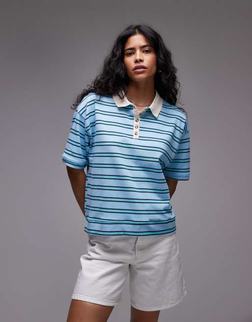 Topshop – Gestreiftes kastiges Poloshirt in Türkis