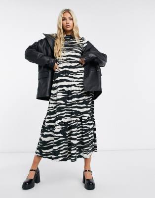 Topshop – Gestuftes Midikleid mit Tierfellmuster in Schwarz-Weiß