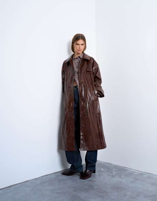 Topshop – Glänzender Kunstleder-Trenchcoat in Braun