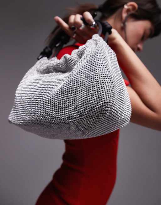Topshop – Gretchen – Verzierte Handtasche in Silber-Optik mit Satin-Henkel