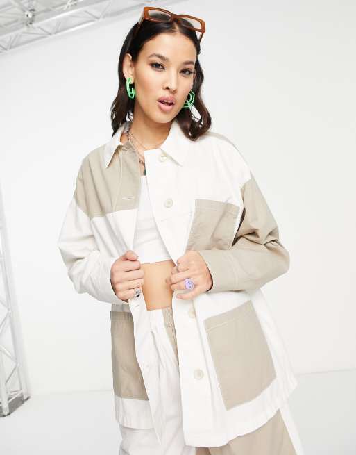 Topshop – Hemdjacke aus Baumwolle mit Farbblockdesign in Weiß und Beige