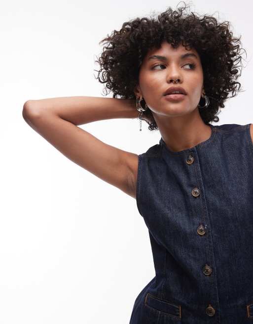 Topshop – Hochgeschlossene Jeansweste in unbehandeltem Indigoblau