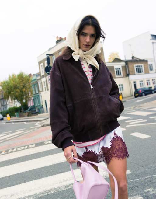 Topshop – Hochwertige Bomberjacke aus echtem Wildleder in Schokobraun