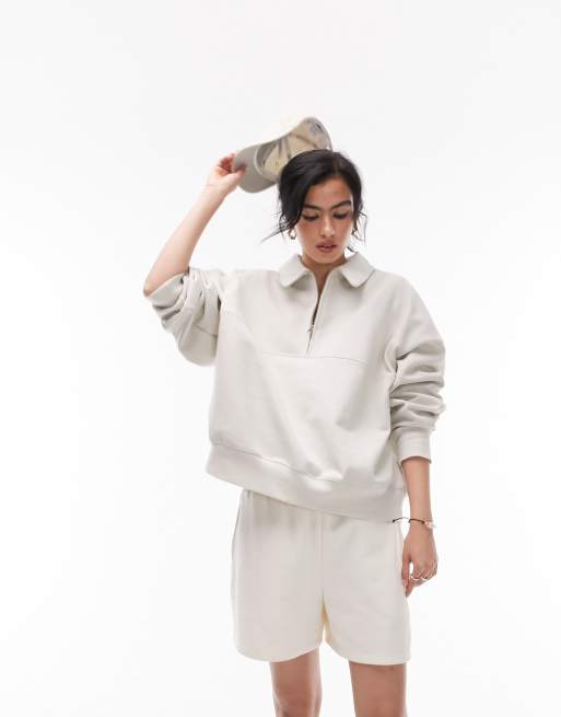 Topshop – Hochwertiges Sweatshirt in neutraler Farbe mit Kragen und kurzem Reißverschluss