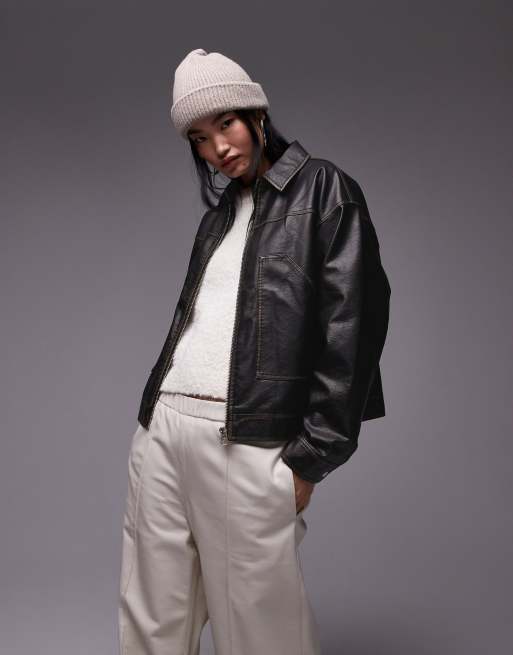 Topshop – Jacke in schwarzer Lederoptik mit Reißverschluss