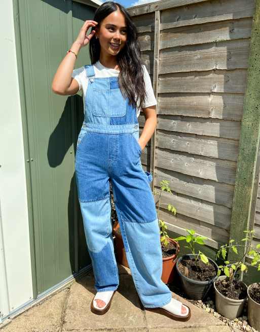 Topshop – Jeanslatzhose im Patchwork-Design in Mittelblau