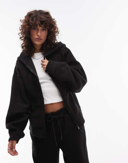 Topshop – Kapuzenjacke aus Teddyfleece in Schwarz