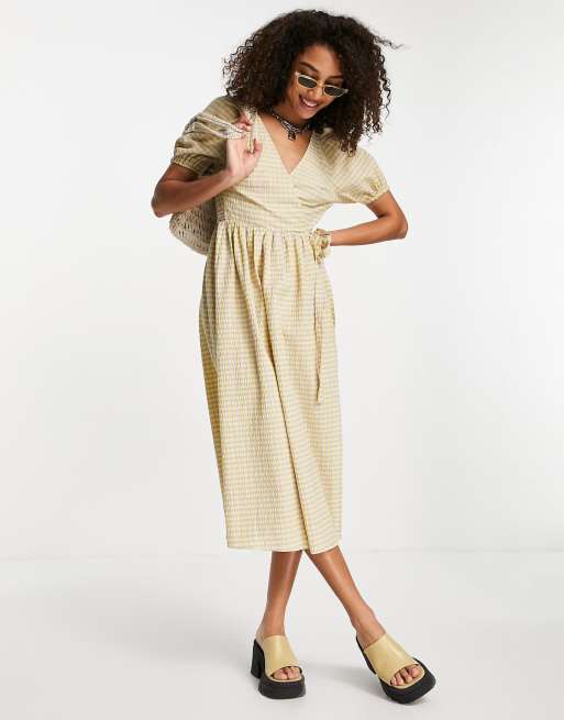 Topshop – Kariertes Wickelkleid aus Seersucker in Limette und Flieder