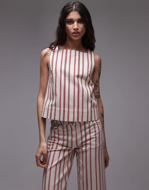 Topshop – Kastiges Jeansoberteil in Rot gestreift mit eckigem Ausschnitt