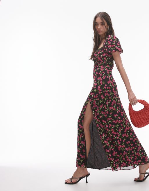 Topshop – Kleid für besondere Anlässe in Rot mit Blumenmuster und gerafften Ärmeln