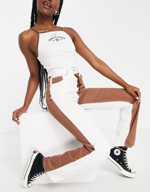 Topshop – Kort – Gerade geschnittene Jeans in Braun und Weiß im Bahnendesign