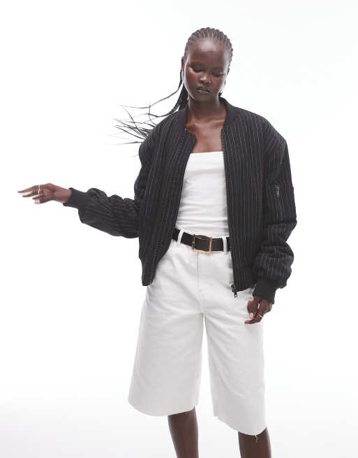 Topshop – Kurz geschnittene Bomberjacke in Anthrazit mit Nadelstreifen und Wollanteil