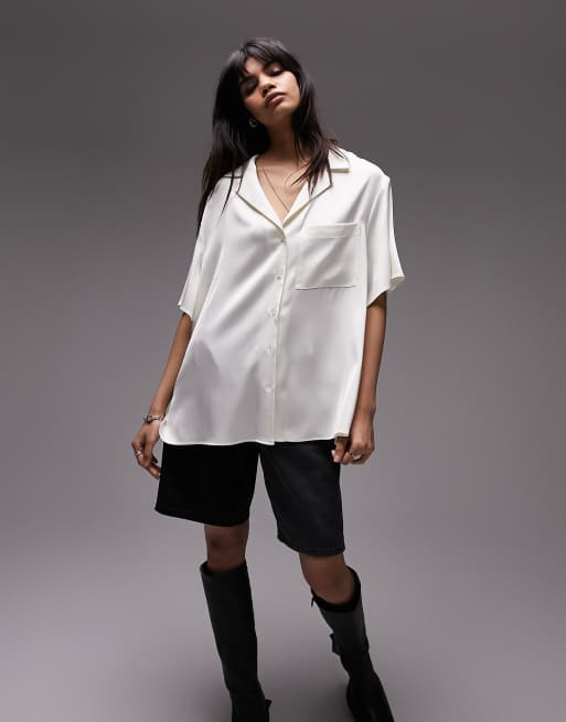 Topshop – Kurzärmliges Satinhemd in Elfenbein