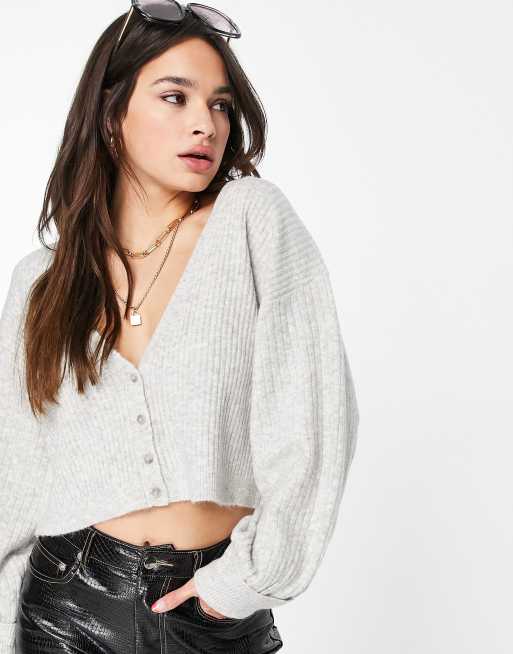 Topshop – Kurze, gerippte Strickjacke in Kalkgrau