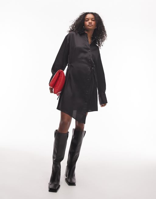 Topshop – Kurzes Hemdblusenkleid in Schwarz mit seitlichem Bindedetail