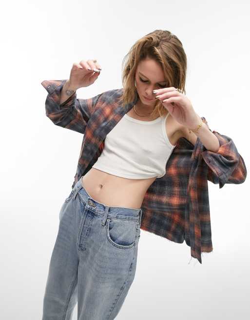 Topshop – Langärmlige, karierte Hemdbluse in Rot mit unversäubertem Saum