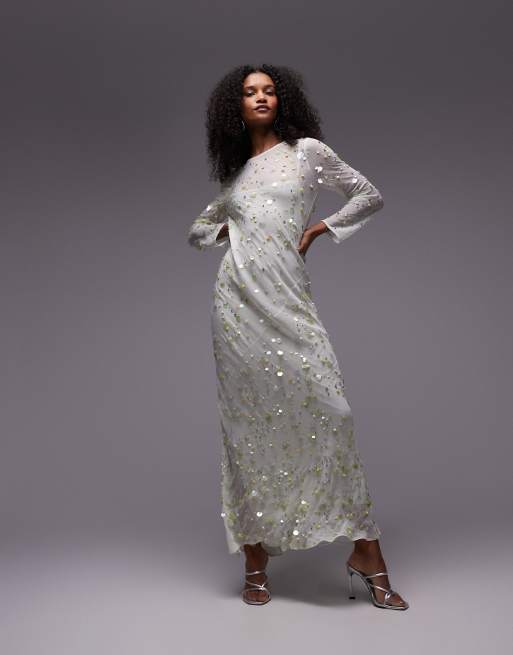 Topshop – Langärmliges Maxikleid in Grün mit Verzierung