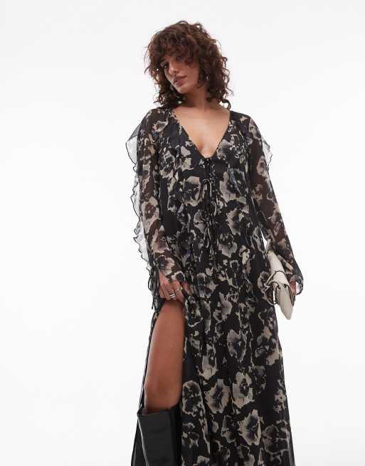 Topshop – Langärmliges Midikleid mit Rüschen und Blumenmuster in Schwarz-Weiß