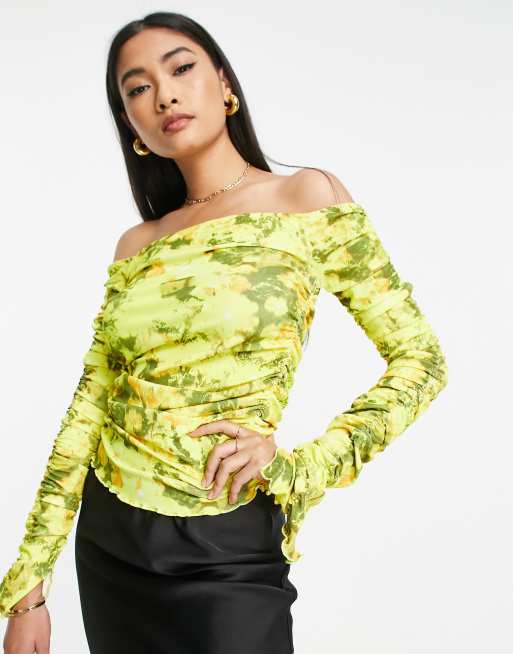 Topshop – Langärmliges Netzstoff-Oberteil in Gelb mit Carmen-Ausschnitt, Rüschen und verschwommenem Blumenmuster