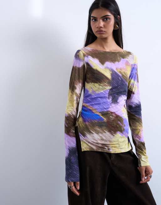 Topshop – Langärmliges Oberteil in Lila mit abstraktem Muster