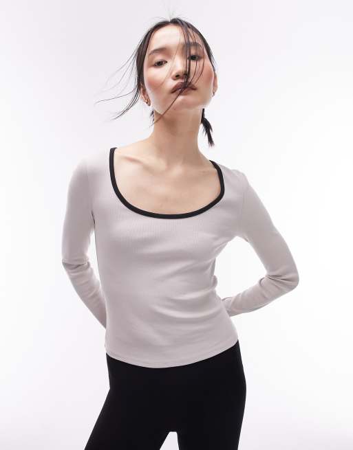Topshop – Langärmliges Oberteil in Steinbeige mit farblich abgesetztem Ausschnitt