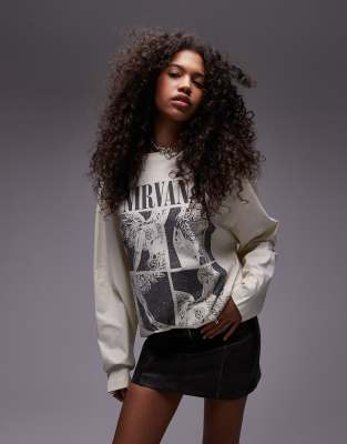 Topshop – Langärmliges Skater-T-Shirt in Ecru mit „Nirvana“-Lizenzprint