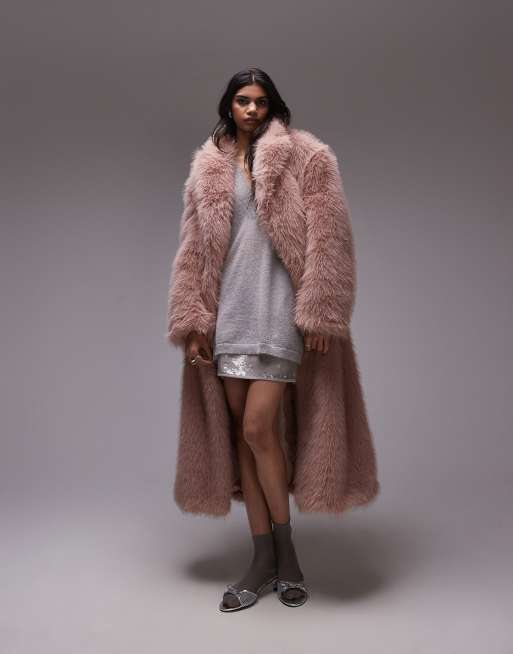 Topshop – Langer Mantel aus Kunstpelz in Rosa