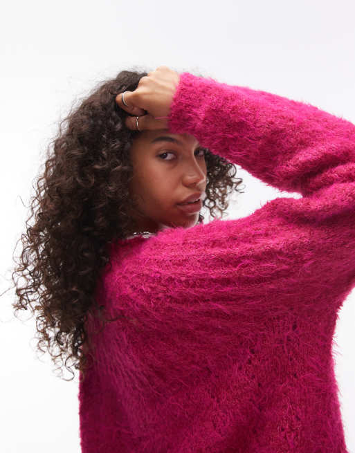 Topshop – Lässig geschnittener, gerippter Pullover aus flauschigem Strick in Magentarot